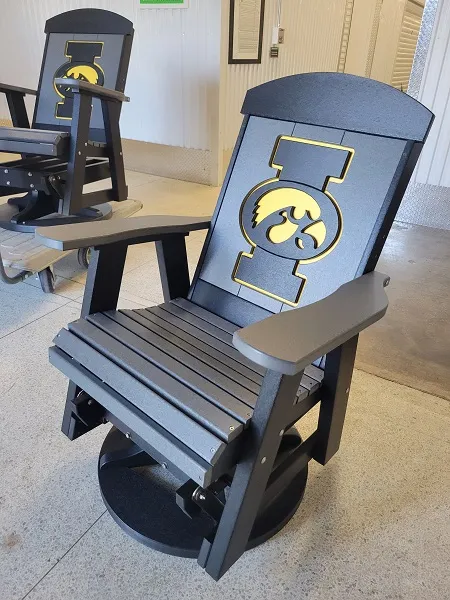 New Poly Vinyl outdoor swivel glider with Iowa Hawkeye team logos (officially licensed).