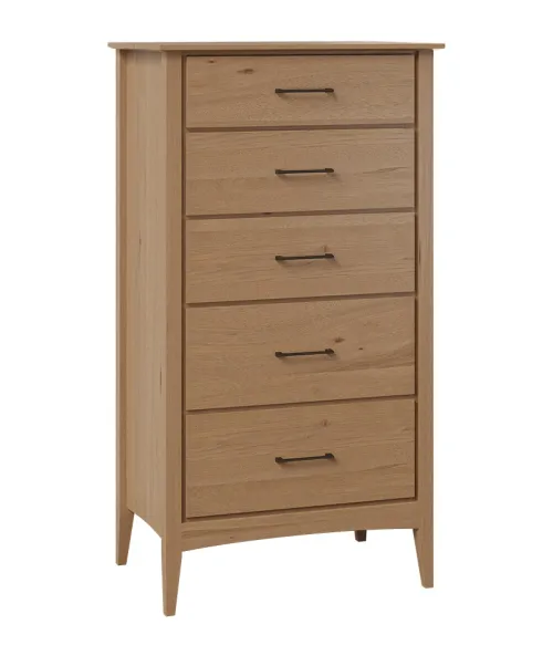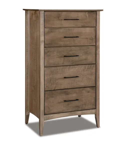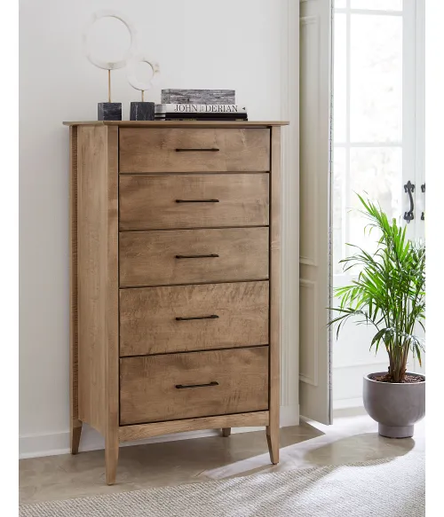 Meticulously crafted with 0.75" solid tops and side panels, the Atlantic 5 Drawer Chest ensures unmatched durability and longevity. The use of solid maple dovetailed drawer boxes speaks to its superior craftsmanship, offering robust storage that can withstand the test of time. Each drawer glides effortlessly, thanks to full extension drawer slides, allowing you to access your items quickly and efficiently.