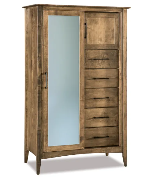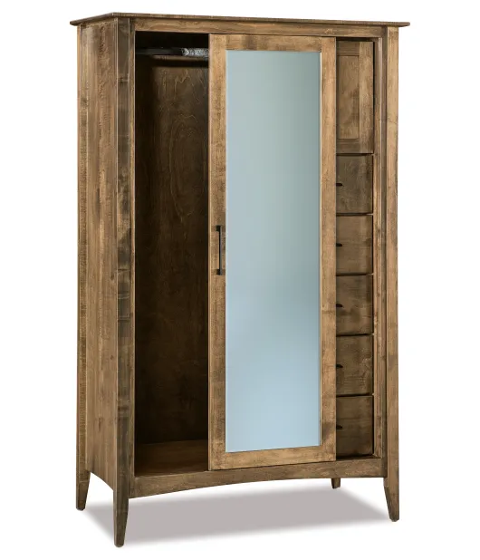 Crafted with precision, the Atlantic Sliding Door Chifferobe features a suite of standard capabilities that ensure durability and ease of use. The 0.75" solid tops and side panels exhibit robust construction, while the solid maple dovetailed drawer boxes underscore a commitment to craftsmanship and longevity. Each drawer glides effortlessly on full extension slides, providing unhindered access to your belongings.