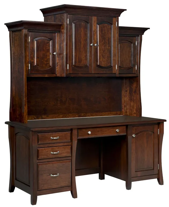 This large and statement-making desk is perfect for the busy business person or home office. With several large and small drawers, including one for a computer keyboard, and a cabinet, this desk offers its owner ample storage space and room to work through deadlines and goals. The credenza and hutch additions provide extra storage space in its cabinets.
