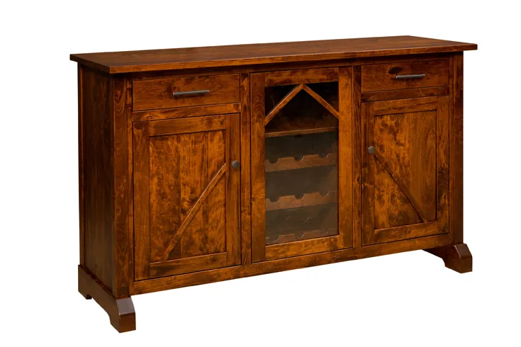 The alluring style and the impressive triangle accent of the Amish Bostonian Buffet exudes a strong appeal to anyone who sees it. This buffet table with stemware holder and wine rack featured by a center glass door will neatly store away your wines, glasses and other suitable wares. Amaze your guests by displaying this piece at the kitchen where it can stand out while complementing with other household furnishing.