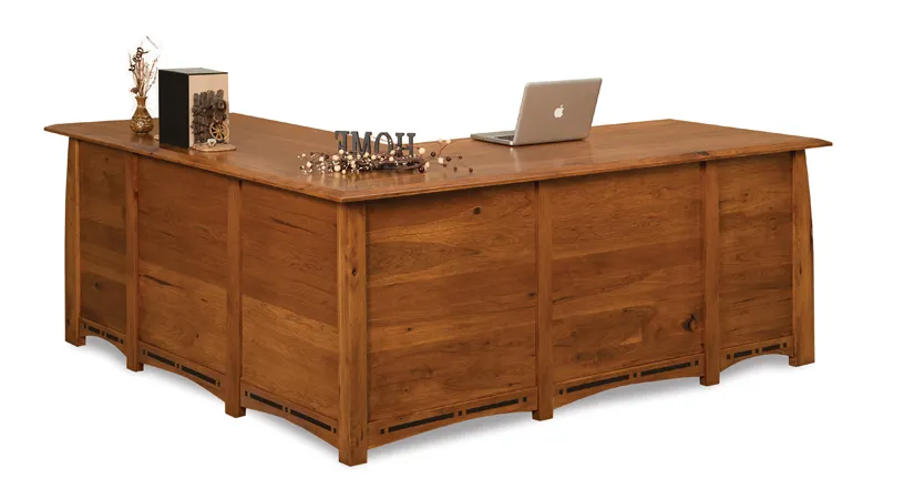The Boulder Creek L Desk with Finished Backside has careful detailing all the way around with arched base skirts and ebony inlays. The ends of the L desk curve warmly outward, with the legs and reverse panels adding emphasis. A champfer edge desk top complements the rounded silhouette.
