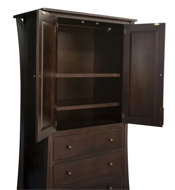 This armoire is a tall and elegant storage option. Each piece in this design family has cutouts by the corner posts. The door compartment has 2 adjustable shelves and clothes rod and three full-extension devetailed self-close drawers. 1 inches thick solid wood top and black wood knobs. The top shelves can be used as a TV armoire if your set is the right size.