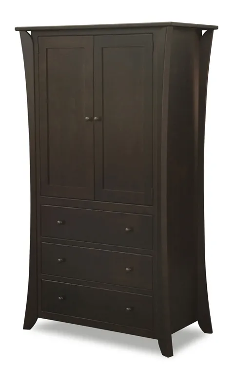This armoire is a tall and elegant storage option. Each piece in this design family has cutouts by the corner posts. The door compartment has 2 adjustable shelves and clothes rod and three full-extension devetailed self-close drawers. 1 inches thick solid wood top and black wood knobs. The top shelves can be used as a TV armoire if your set is the right size.