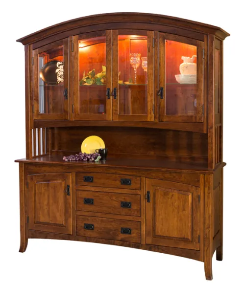 The Cambria Hutch reminds the viewer of sunlight. With its upward curves, backlight, and shining glass doors, the Cambria brightens a household and makes you think of a distant sunset. Producing the upward curve are four glass hutch doors and two opposing buffet doors on either side of the three drawers; the top buffet drawer is curved in a way only thoughtful craftsmanship would produce. Side slats and windows let light and shadow penetrate. This hutch will look magnificent with Shaker-style furniture in a classic-modern environment. If you have plenty of treasures to display in a four-door hutch, the Cambria Hutch will faithfully keep them for years.