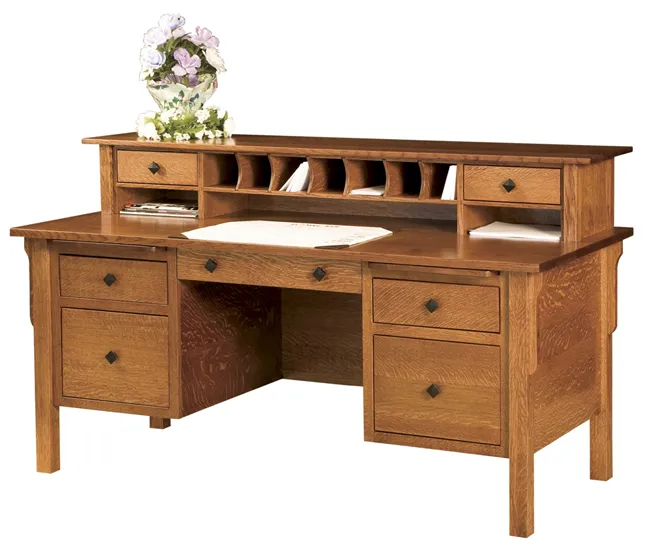 If you prefer not to have your desk up against the wall or blocking your view, the Centennial flat top desk is perfect. With a number of drawers in the desk, it is first and foremost practical. The hutch built onto its top has additional storage compartments and drawers. And this simply designed desk will not block your view as the top of it is below eye level.