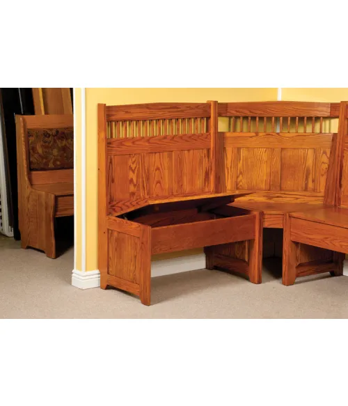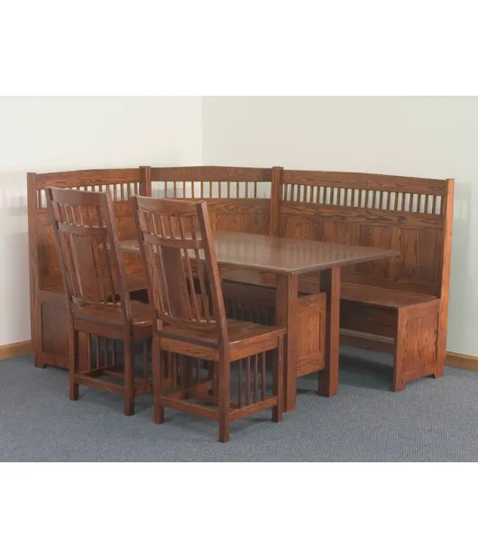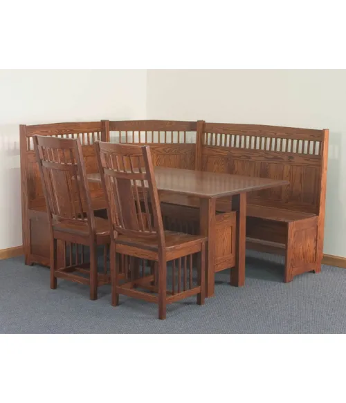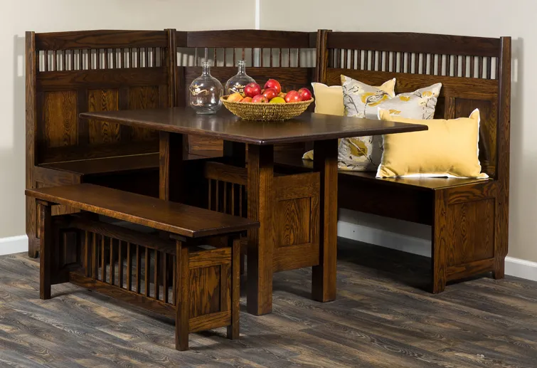 This beautiful nook set includes two benches and a corner piece, a table and an extra backless bench for more seating. The table can fit up to two chairs if you’d rather have individual seats instead of a bench. If you opt for a bench, it will have storage space built into its base. The corner bench also has storage space built in if you opt for chairs. This nook's stylish slats add excitement while the classic wood keeps the nook feeling like home.