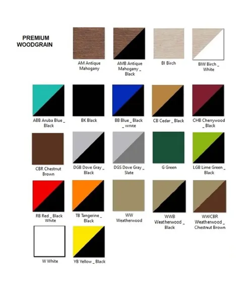 *Available in White, Black, Chestnut Brown, Weatherwood, Green, Dove Gray/Slate, Dove Gray/Black, Cedar/Black, Weatherwood/Chestnut Brown, Weatherwood/Black, Cherrywood/Black, Aruba Blue/Black, Red/Black, Tangerine/Black, Yellow/Black, Lime Green/Black, Blue/Black, Antique Mahogany and Antique Mahogany/Black.