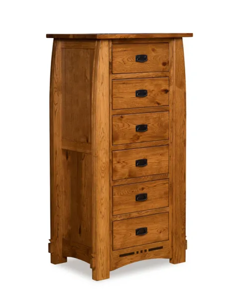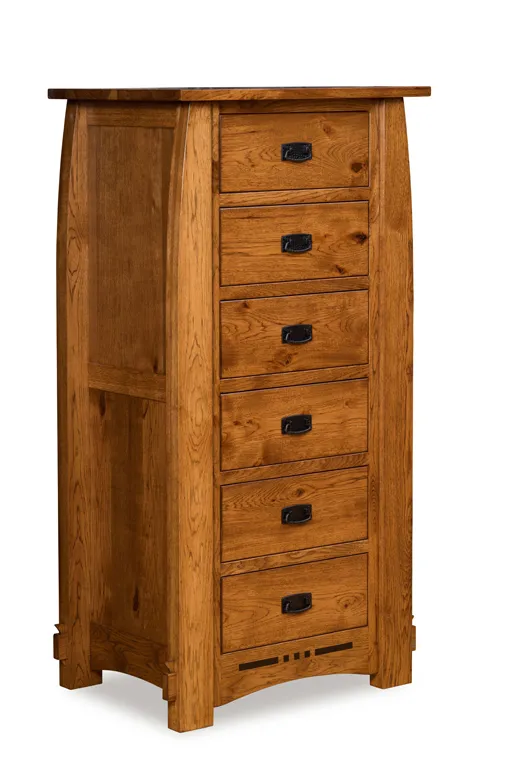 The Colebrook 6 Drawer Lingerie Chest has elegant flush drawers and a Mission top. This chest has legs that curve in slightly toward the top, and expose mortise joints near the base. The arched base skirts feature an ebony inlaid front. It is a beautiful match for any Colebrook or Boulder Creek furniture. This handcrafted chest is created to preserve your most precious things.
