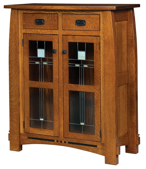 Transform your home into a beautiful art deco space with this cabinet. The Colebrook storage cabinet has one large cabinet and two drawers to organize your belongings. The doors show off glass panels with vintage inspired artwork. The sideboard has metal handles and knobs that are complemented by the black stained pattern.