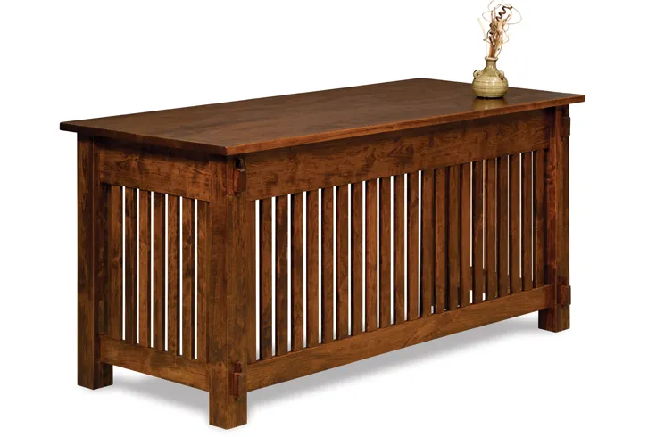 An heirloom desk is a dream to write on. With the beauty of wood slats, this Craftsman 3 Drawer Desk has a finished backside showcasing Mission-style vertical lines all around. More detail of this handcrafted desk includes exposed mortise joints. With leg room spanning its full width, this piece makes a good writing desk or laptop desk. Its simple style will make it the pride of any room, classic or modern.