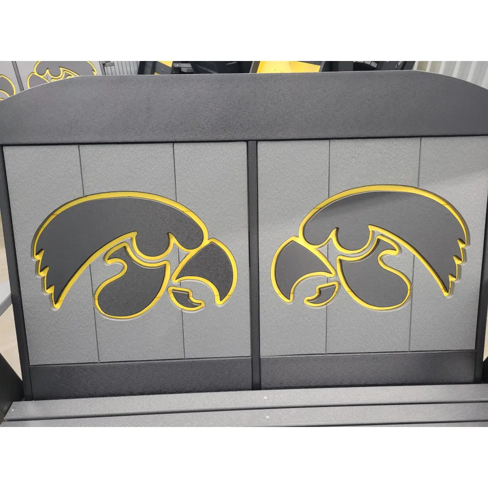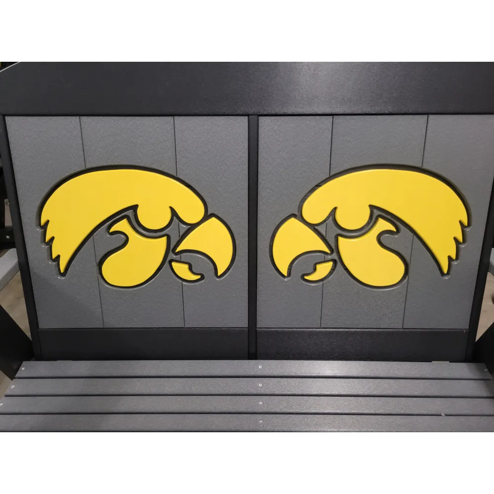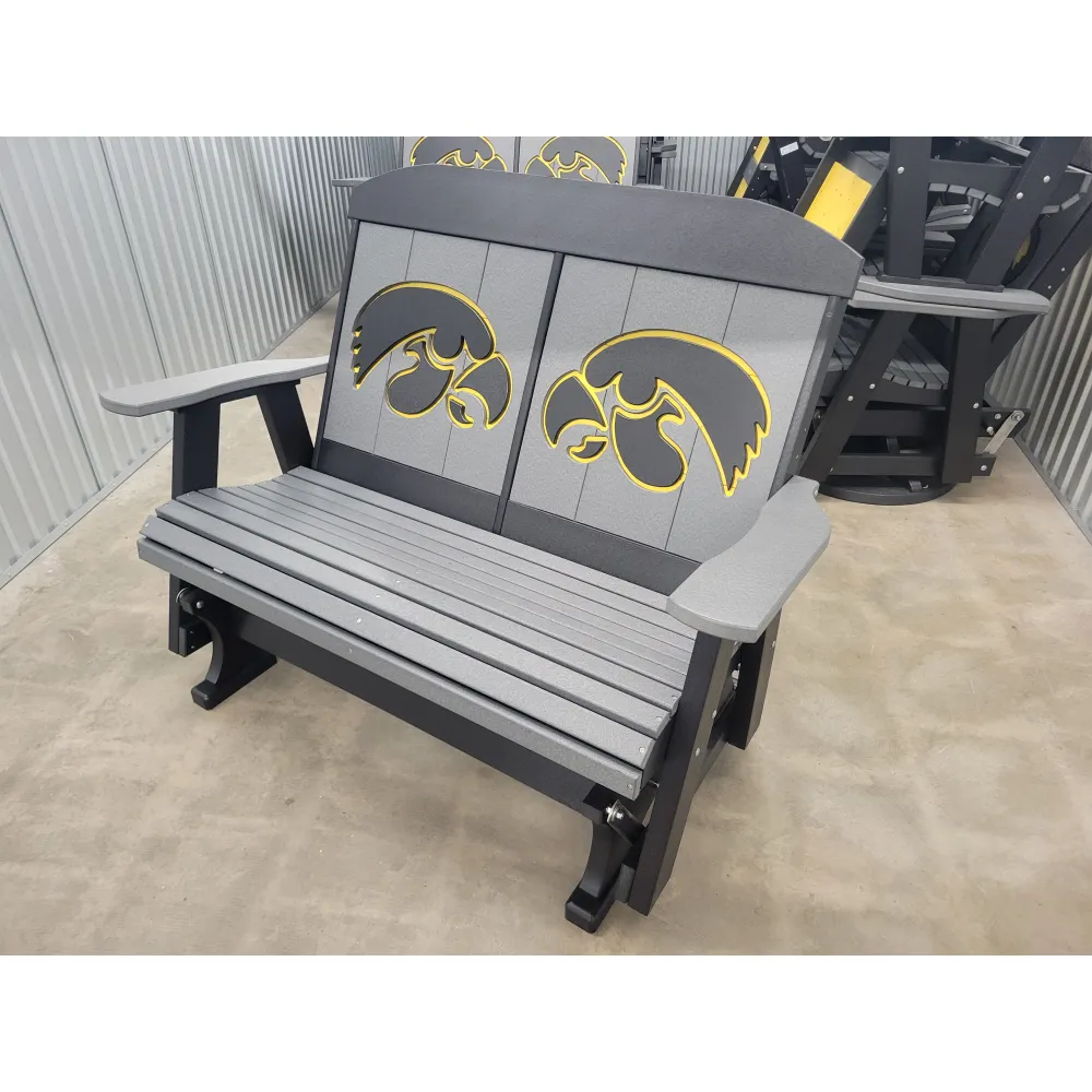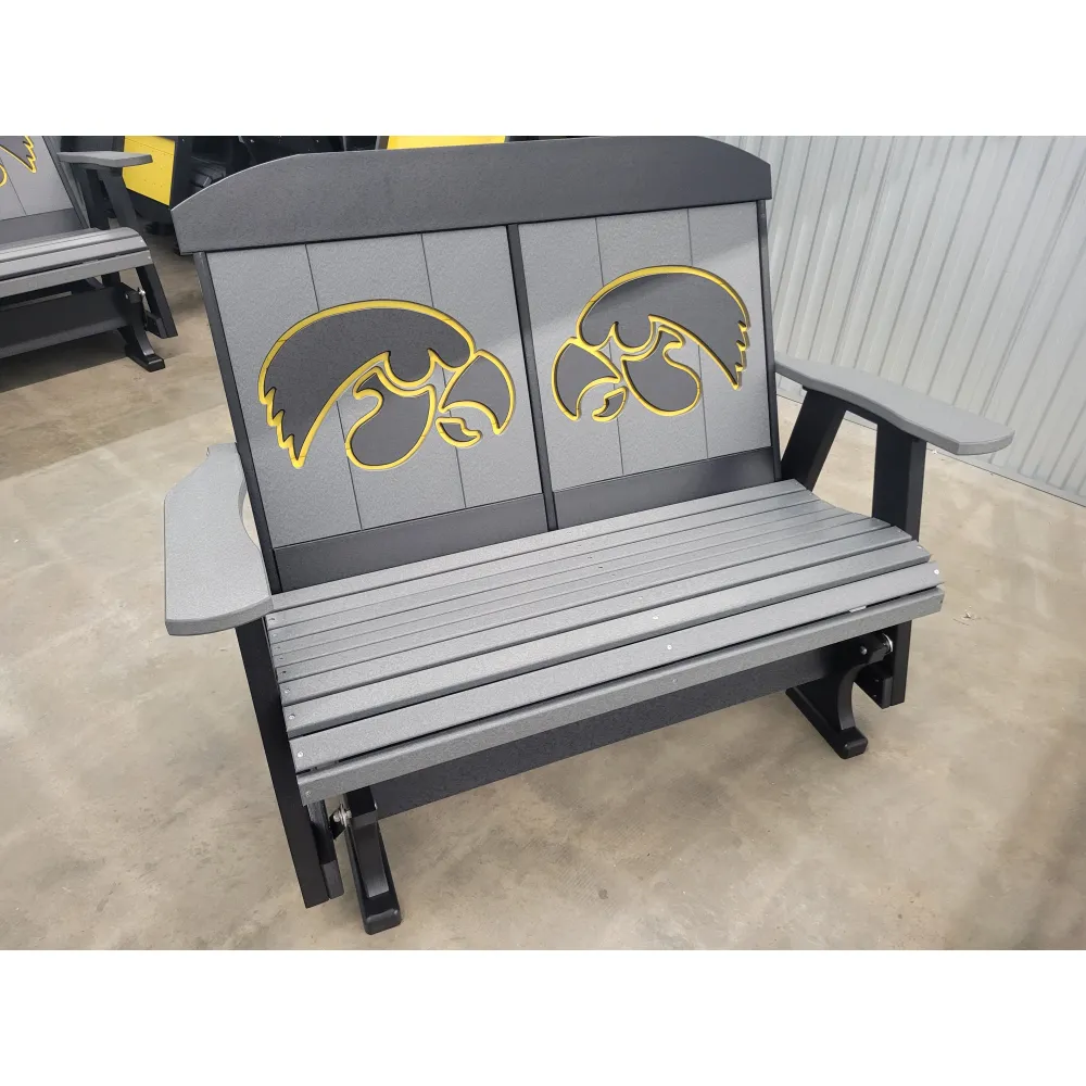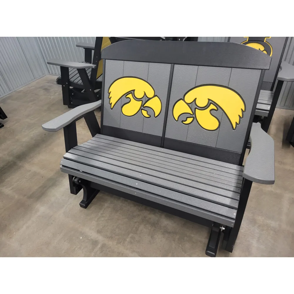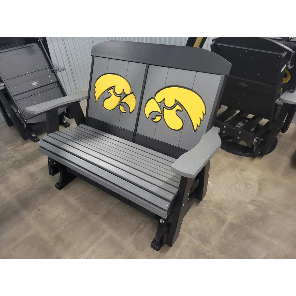 New Poly Vinyl outdoor loveseat gliders with Iowa Hawkeye team logos (officially licensed).