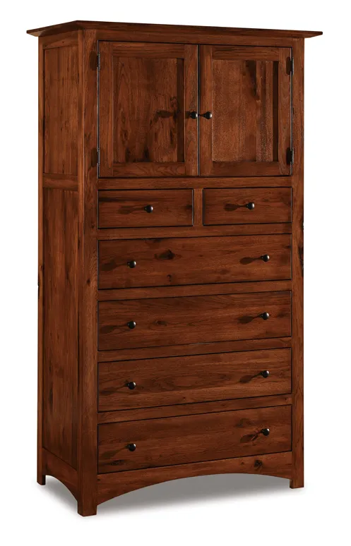 The pictured Finland Chest Armoire is built in rustic hickory with Golden Harvest stain.