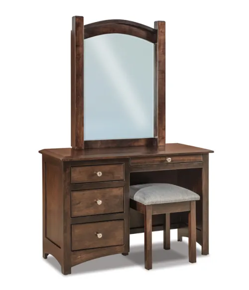 Solid wood bedroom vanity set is pictured in brown maple with Onyx stain.