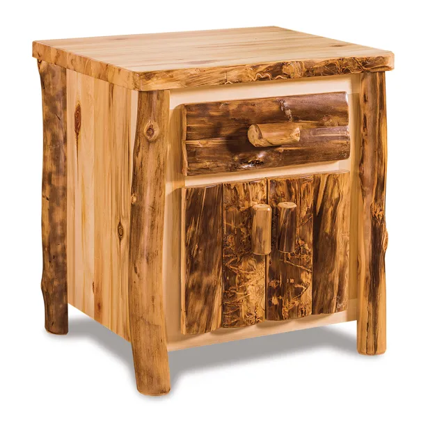 The pictured Fireside Rustic 1 Drawer 2 Door Amish Night Stand is built in aspen with natural finish.