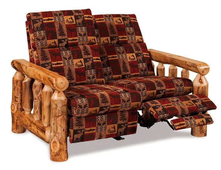 The pictured Fireside Rustic Reclining Loveseat is built in aspen with natural finish and 16-45 Erie Fabric.
