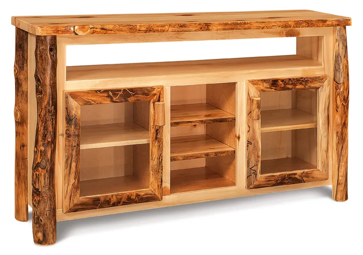The pictured Fireside Rustic TV Cabinet with Opening and Shelves is built in aspen with natural finish.