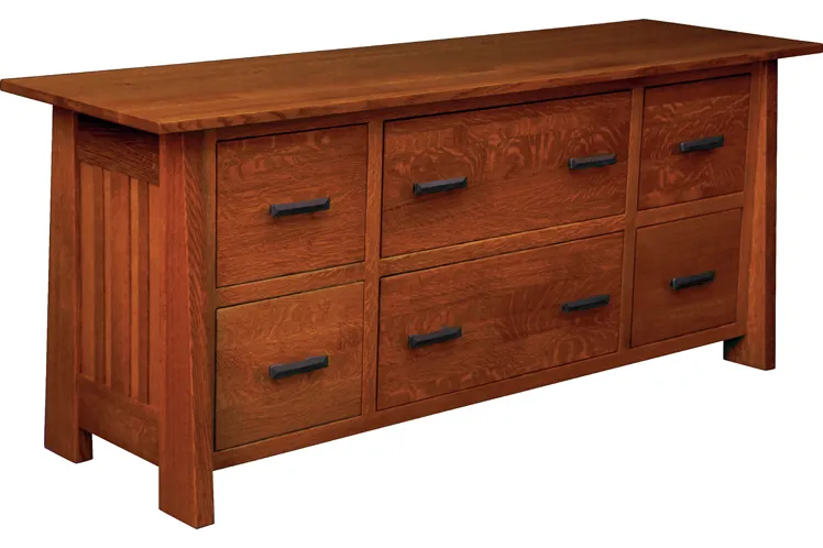 The pictured Freemont Mission 6 Drawer Credenza is built in qs oak with Michaels Cherry stain.