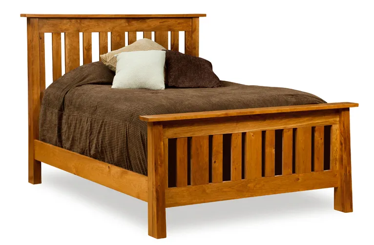 The Freemont Mission Slat Bed combines Mission style with surprising variation in its slats. In the headboard, the slats occur in sets of three, with two narrow slats on each side of one broad one. Combined with the spaces between each set of three slats, the varied lines add modern pizzazz. Should you choose a high headboard, the legs have angular fronts for more modern design. The Freemont is a hardwood bed that looks cool and elegant at the same time.
