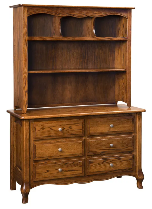 The Amish French Country 6 Drawer Dresser features 6 full extension drawers, arched raised panels and scalloped skirts. This solid hardwood piece is sanded by hand to smoothly combine all the features together.