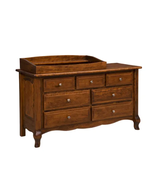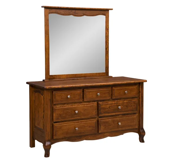 The French Country 7 Drawer Dresser with Mirror has just enough rococo style to give your bedroom personality, but it stays within the bounds of elegance. The mirror frame is topped with waves, as is the base. The legs are cabriole curved, and every edge of this dresser is softened. Arch panel sides and raised panel drawers give this dresser depth from all angles. It is clear that this heirloom French style dresser is carefully handcrafted for the lover of traditional furniture.