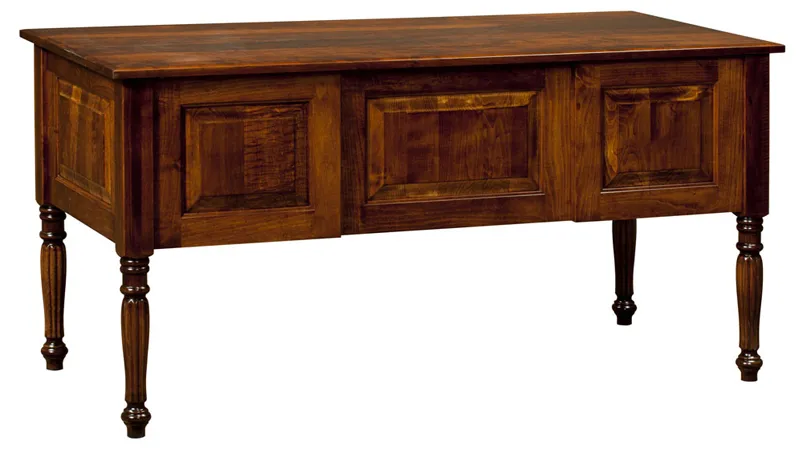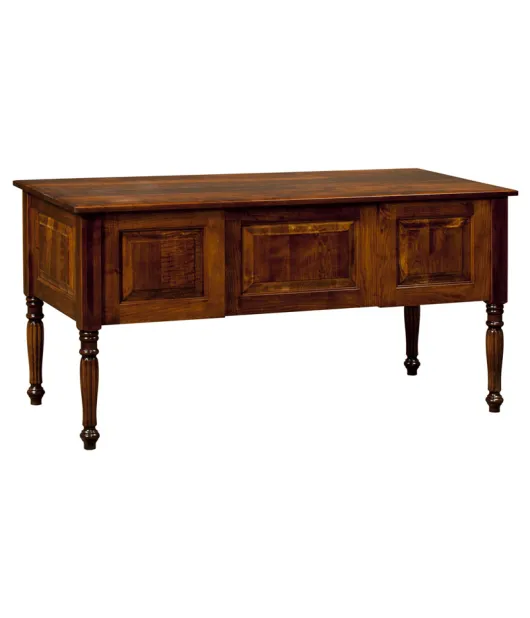 For an elegant desk to become a focal point in your office, the Garrison flat top desk is a natural choice.This large desk has ample surface area for writing, organizing and laying out a project.The desk has five drawers that can be pulled out for additional storage space.Each drawer has a stylish metal handle.The legs of this desk are highlighted with graceful, intricate scrollwork details, typical of Queen Anne styling.The external sides of the desk have inlaid panels for another touch of sophistication.