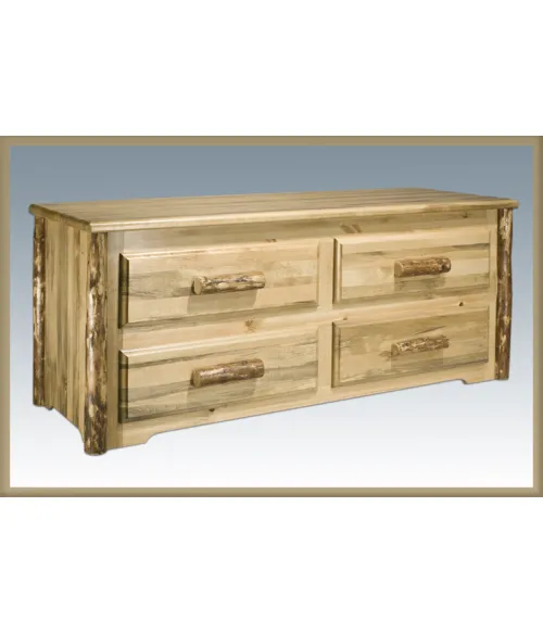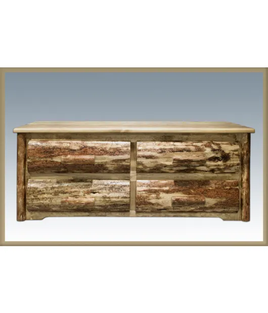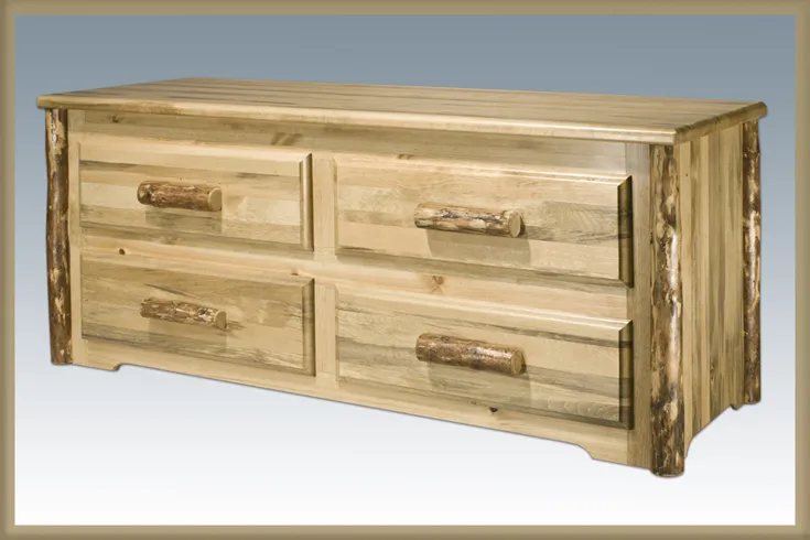For rustic storage, this sitting chest sturdily holds what you need and doubles as a bench. The low top is a gorgeous wood surface while the front mixes geometric drawers with varied woodgrain.