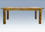 The Glacier Country Four Post Dining Table with Leaves has giant log legs for prominent rustic style that is durable enough to take leaves. The logs still show some bark, and the top is finished in elegance.