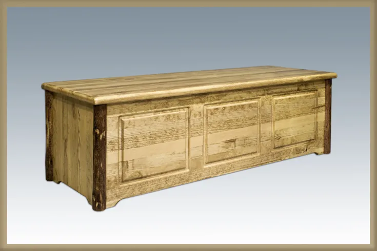 Keep it simple with a hard wood blanket chest. This chest features quaint carving and rustic woodgrain. The straight lines allow the chest to match other Glacier Country pieces or contrast a mission setup.