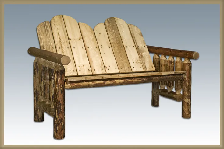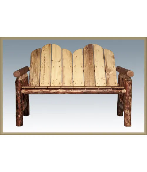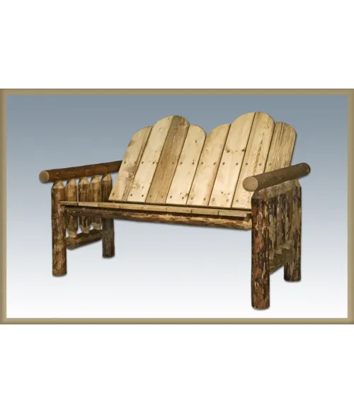 With log arm rests and a relaxing back, this wooden Adirondack bench is the perfect match for a deck in the wilderness.