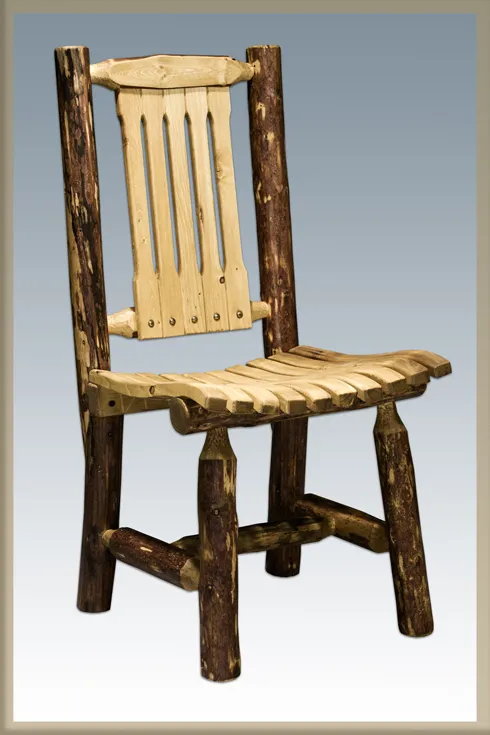 Experience the rustic outdoors in the comfort of this beautifully designed chair with sturdy log legs and a gracefully slatted seat and back.