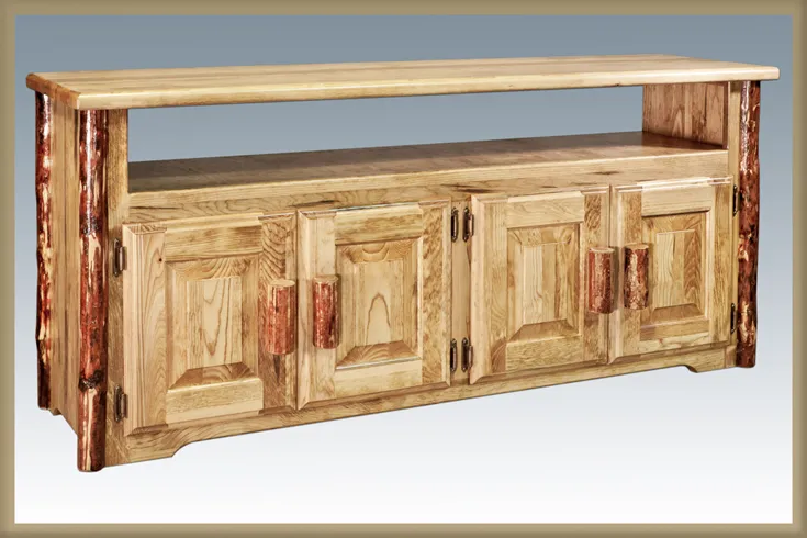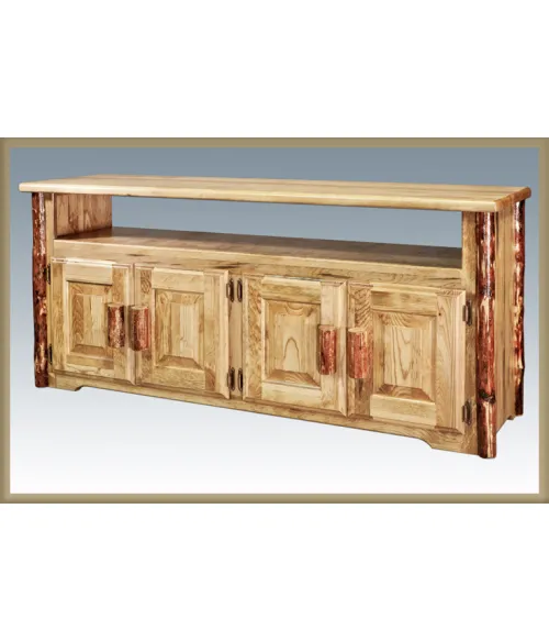 Watch TV in a rugged setting with a rustic pine TV stand. This stand's backless shelf fits your electronics and their cords, and allows ventilation. The two wide cupboards maximize storage space.