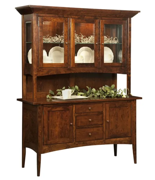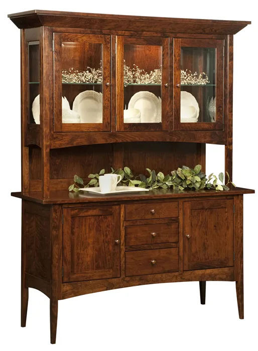 Simply stunning, the Hammond hutch is a sophisticated way to organize your dining accessories and tableware. The hutch has classic design elements combined with ample storage to prove a valuable piece of furniture in any home. The bottom half of the hutch has two large cabinets and three drawers as well as space to display decorations on top. The top of the hutch has one large cabinet with glass shelving, built-in lights and three glass-paned doors.