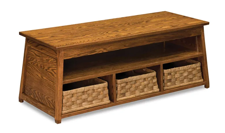 Choose a bench that provides comfortable seating and storage space. The heritage bench has two levels of shelving within it including one row for three woven baskets. The angled shape of the bench makes it lovely and unique.