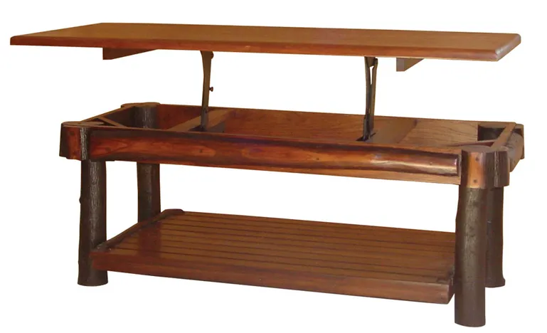 This table may be rustic with its log legs, but it is both modern and elegant with its slatted self and lift top. Your handcrafted coffee table can store a surprise inside.