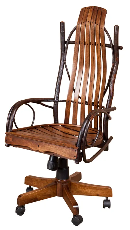 Work in the coolest office in the countryside with this twig and hardwood desk chair. With contoured slatted seat and back, wooden base, and curved twigs, this chair combines comfort and rustic style.Â