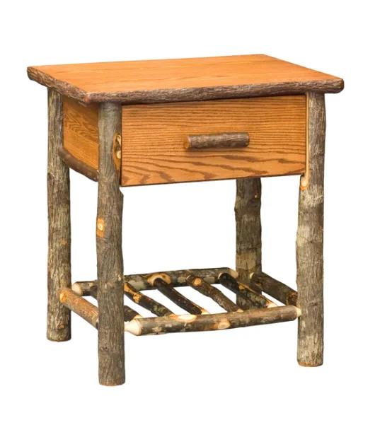 This nightstand has a functional Mission structure but has the rustic style of hickory twigs. Sturdy legs and Mission-like slats on the bottom shelf create a distinctive piece of hickory twig furniture.
