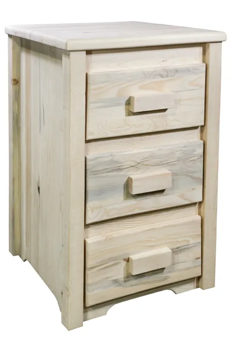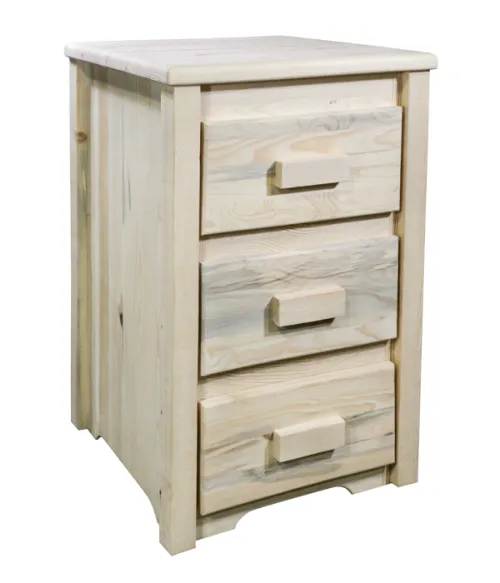 The unique Homestead Nightstand fits squared hardwood pieces together in a 3-dimensional look with rectangular drawer pulls, protruding legs, and drawers that are not flush.