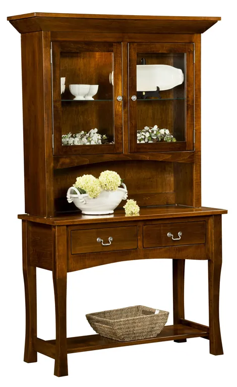 If you are looking for a hutch but like unimposing and elegant furniture, the Hudson hutch is an ideal solution. This hutch has slender legs, a built-in ledge underneath the body of the hutch which has two drawers. The top portion of the hutch has two glass-paned doors, glass shelves and built-in lights to showcase your belongings.