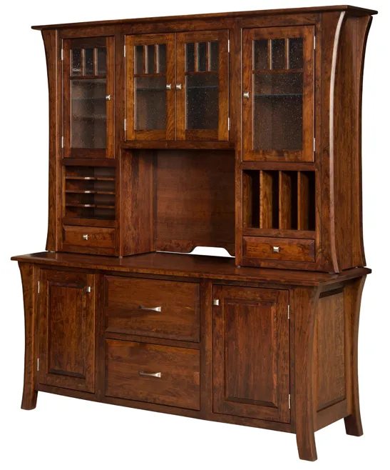 This Amish furnishing features a bowed top and case, two 21" lateral file drawers with fully extendable slides and two doors with an adjustable shelf. On the other hand, the hutch showcase the same design but with different shelves and slots for storage.