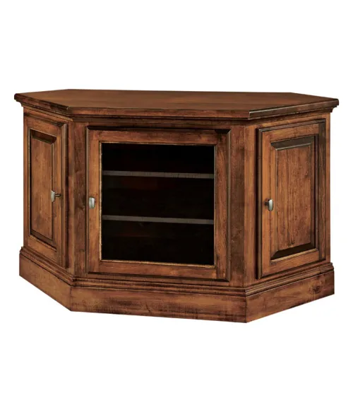 This Kincade Corner TV Stand is bult to show off its luxurious raised panel doors, with crown molding beneath the top and above the solid base. This heirloom stand for a 50'' TV has plenty of storage inside.