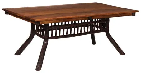 Your country dining room deserves the best hardwood furniture nature has to offer. This table starts durable, with a solid wood top, and combines strength with style in its hickory twig legs and spindled braces.