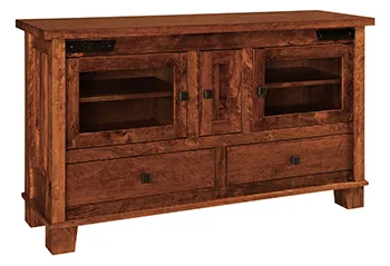 This Larado TV Stand for a 60'' TV has flush bottom drawers and one flat panel door between the two glass doors. Metal knobs complement the plates decorating the top front corners.