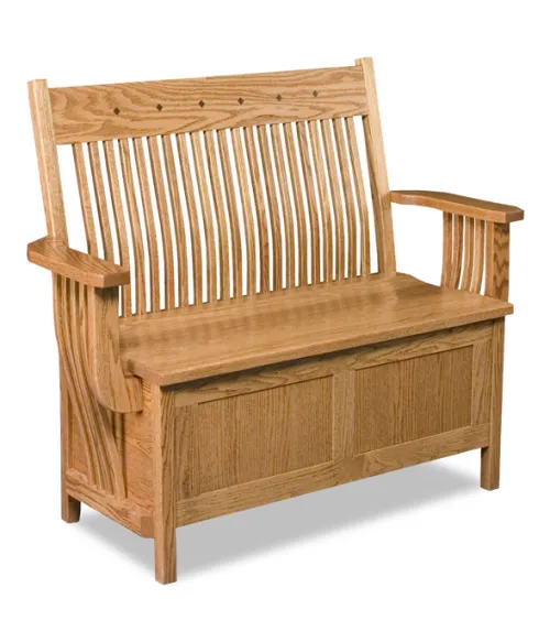 Stately and regal, this Mission bench is a most petite version of a collection of classic benches. The oversized backrest has numerous slender slats and an arched top that adds flair to this traditional bench. The arm rests mimic the backrest with simple slats as well.