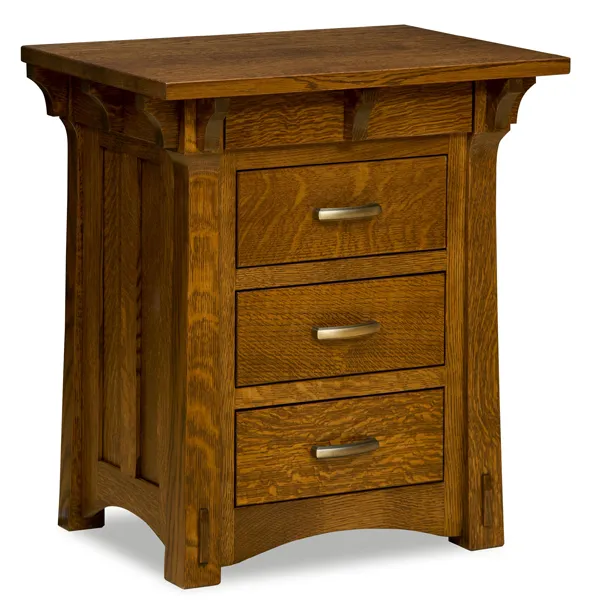 These lovely nightstand, available in two sizes, stands out because it features corbel rows on crowns and mortise and tendon joints. There are three visible drawers and one hidden drawer making this a piece with substantial storage.