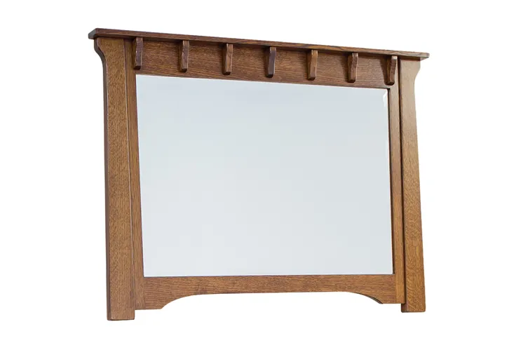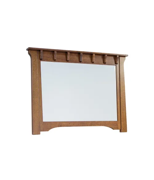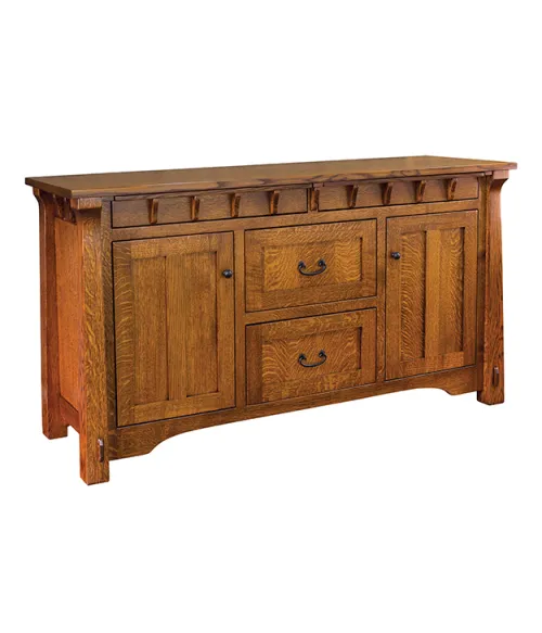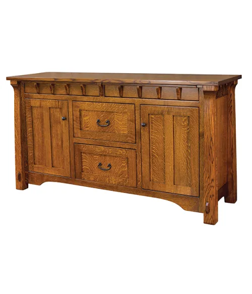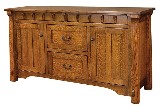 The Manitoba family of furniture is unapologetically Mission in style with its flared details and in-laid panels.