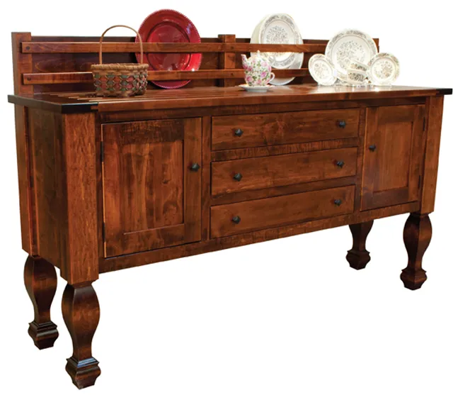 The Marriot Sideboard stores whatever you need but notice the backsplash: it has slats to display dishes and platters, making it as decorative as it is functional. Just as decorative are the carved baluster legs.