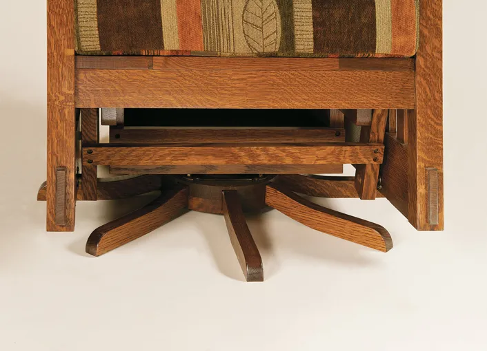The McCoy Swivel Glider has its wood back angled just right for the cushion. The arm rests are curved for comfort. Even the swivel base is built using eight solid wood feet for heirloom beauty.