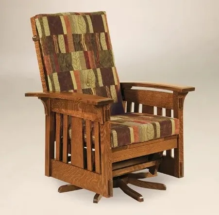The McCoy Swivel Glider has its wood back angled just right for the cushion. The arm rests are curved for comfort. Even the swivel base is built using eight solid wood feet for heirloom beauty.