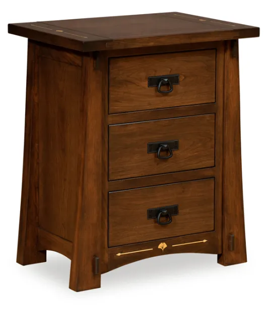 This nightstand has yellow gingko leaf inlays in the front base skirt, as well as on each side of the solid top. Exposed mortise joints decorate the front legs. All four legs run the length of the nightstand and angle outward around arched base skirts to create a Shaker-style heirloom.